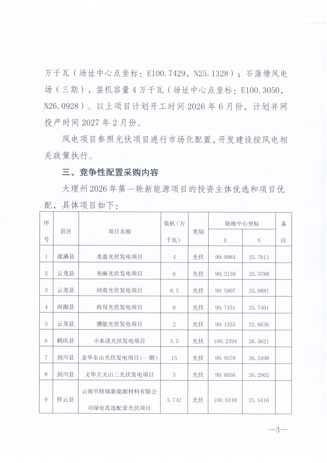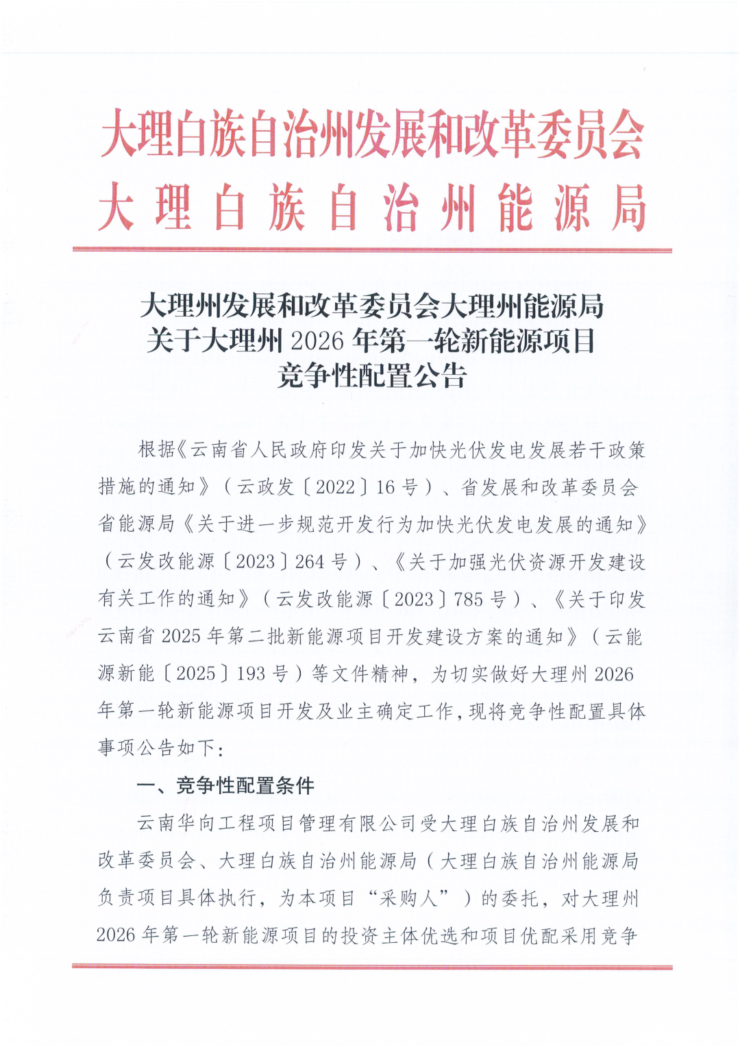 发表时间:2026-03-08 15:56:34 浏览次数:199 〖返回〗3月5日,云南大理州发布《关于2026年第一轮新能源项目竞争性配置公告》。